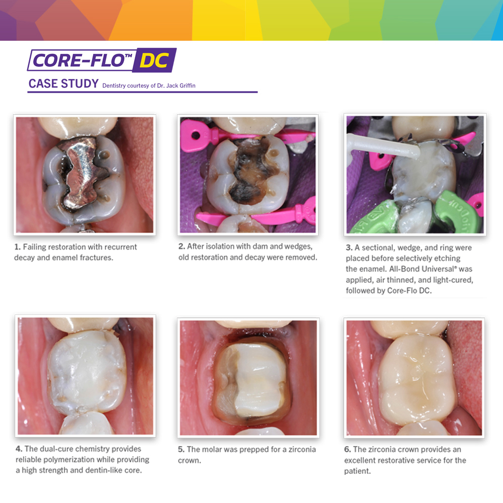 CORE-FLO DC is a dual-cured core material that is dispensed with an auto-mix dual-syringe dispenser. CORE-FLO DC is ideal for core build up, post cementation, and as a dentine replacement material. CORE-FLO DC’s superior compressive and flexural strength offers the clinician reliability and durability when fabricating direct restorations. In a simplified technique, the clinician can cement the post and build-up the core with one single application. CORE-FLO DC is radiopaque and available in two aesthetic shades, Natural/A1 and Opaque White to meet all of your direct and indirect restorative requirements.