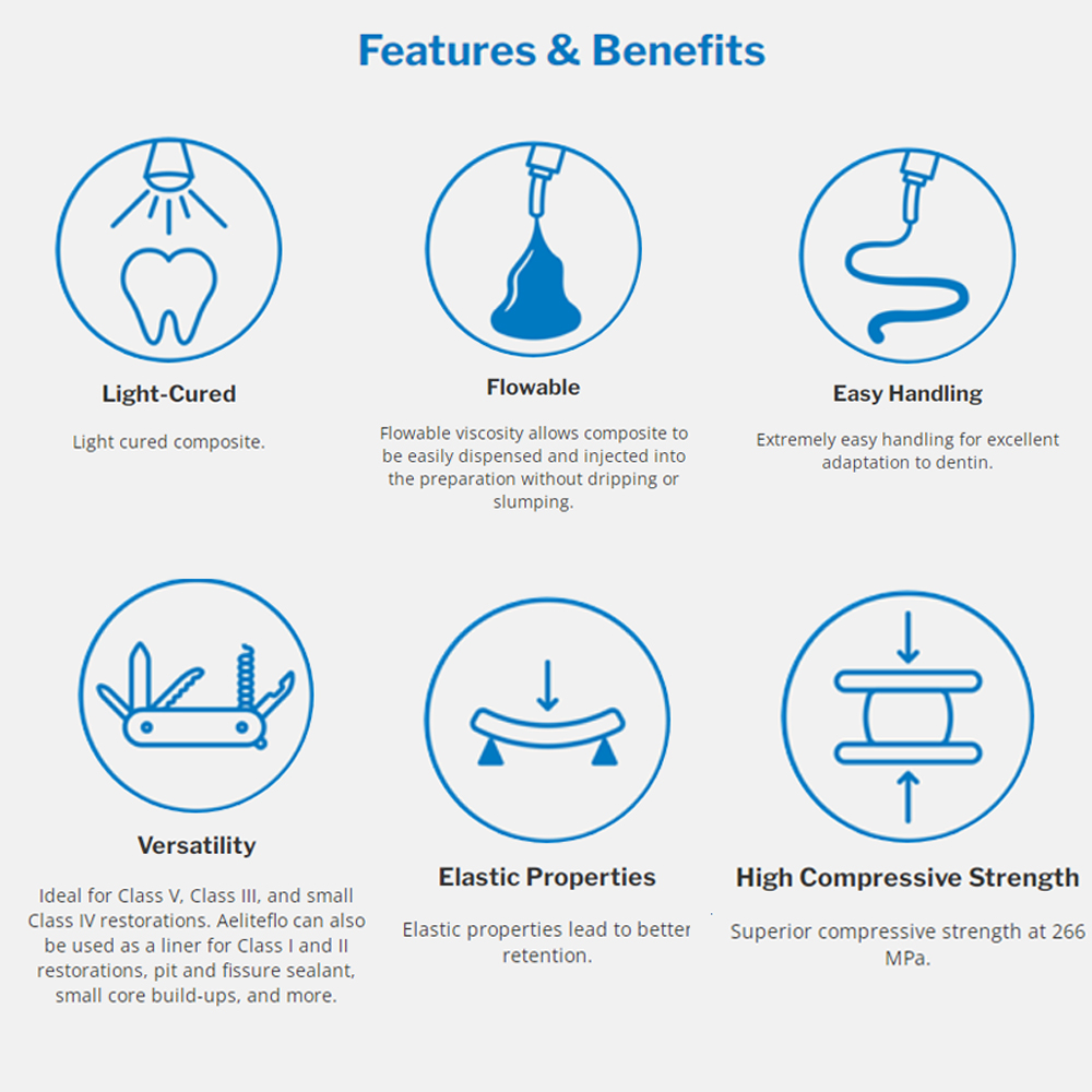 • Aeliteflo leads to better retention due to its elastic properties. Excellent for abfraction lesions and Class V defects