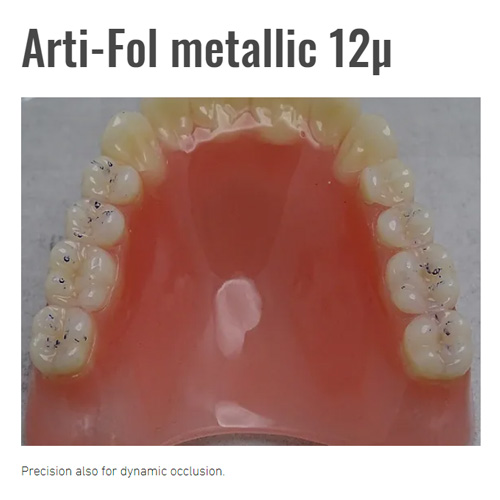 Bausch ArtiFol Metallic is a 12 micron Shimstock film that is tear-resistant (ideal for resistance testing), two sides of colour, antistatic, and excels on ceramics, highly polished metal surfaces, plastics, composites, and natural teeth.