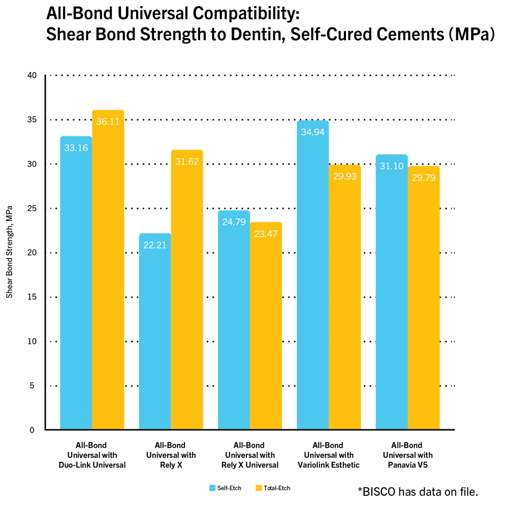 All-Bond Universal’s hydrophobic formula yield proven high bond strengths: 42.5 Mpa to etched dentine.