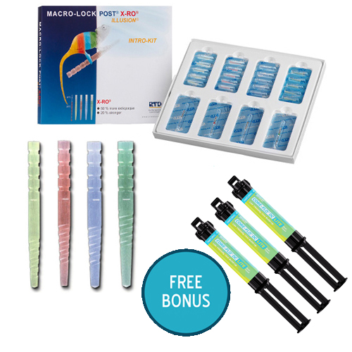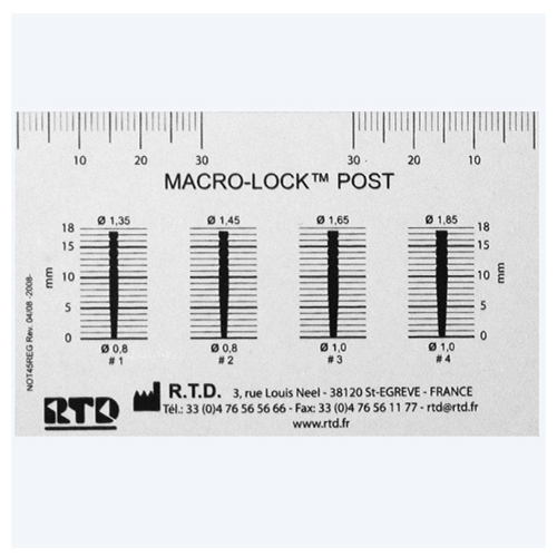 RTD Macro-Lock Illusion XRO Post Kit contains: 20 posts each hygienically packed into individual blisters: 5 each of #1, #2, #3, and #4 and 6 autoclavable drills: 2 universal, 1 each of #1, #2, #3, and #4 and Instructions
